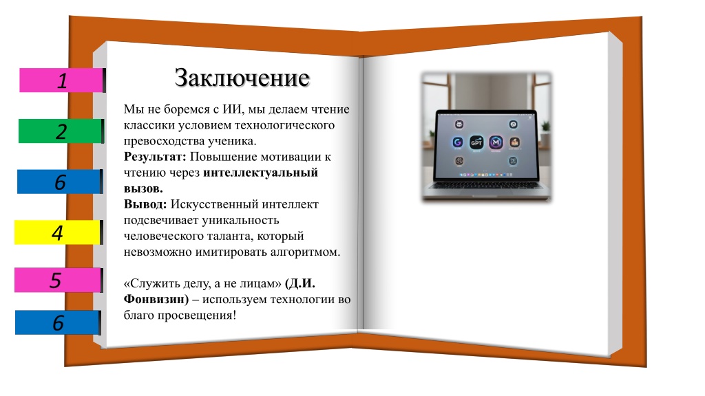 1 4 2 6 Заключение Мы не боремся с ИИ, мы делаем чтение классики условием технологического превосходства ученика. Результат: Повышение мотивации к чтению через интеллектуальный вызов. Вывод: Искусственный интеллект подсвечивает уникальность человеческого таланта, который невозможно имитировать алгоритмом. «Служить делу, а не лицам» (Д.И. Фонвизин) – используем технологии во благо просвещения!