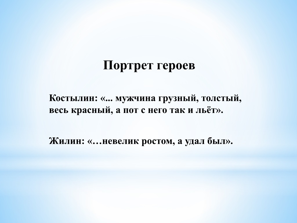 Портрет героев Костылин: «... мужчина грузный, толстый, весь красный, а пот с него так и льёт». Жилин: «…невелик ростом, а удал был».