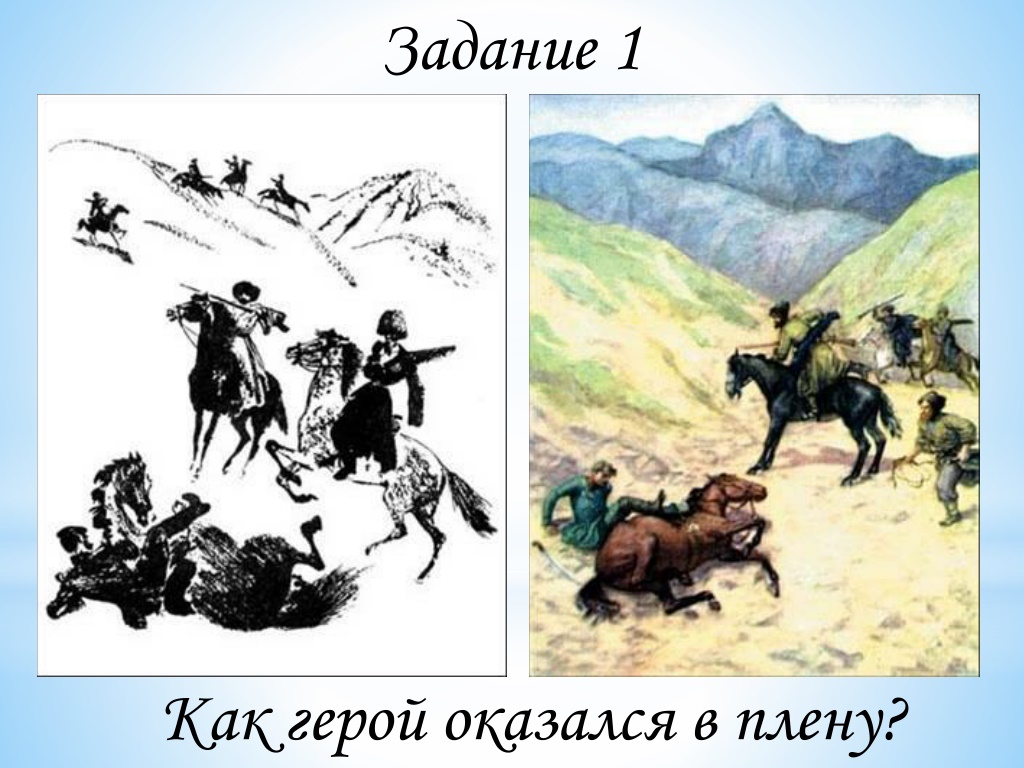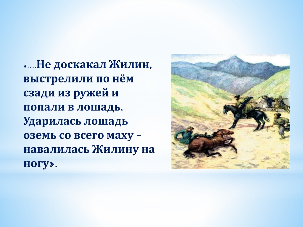 «….Не доскакал Жилин, выстрелили по нём сзади из ружей и попали в лошадь. Ударилась лошадь оземь со всего маху -навалилась Жилину на ногу».
