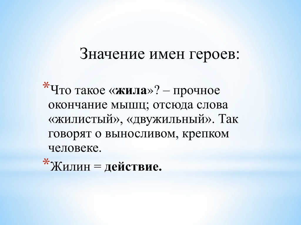 Значение имен героев: • Что такое «жила»? – прочное окончание мышц; отсюда слова «жилистый», «двужильный». Так говорят о выносливом, крепком человеке. • Жилин = действие.