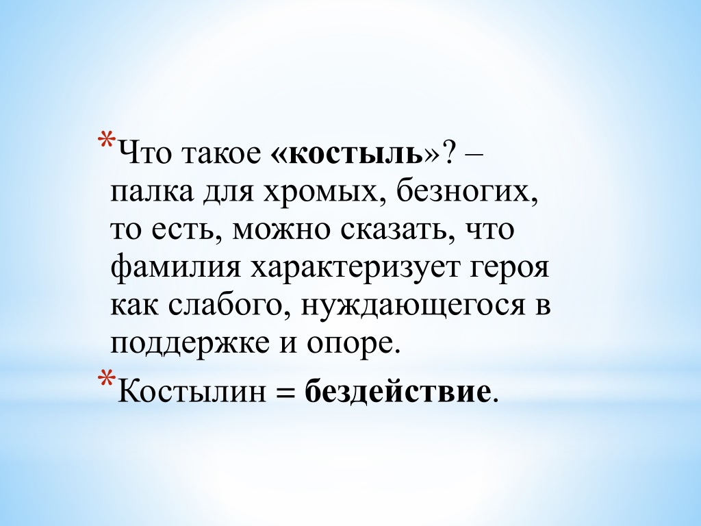 Что такое «костыль»? – палка для хромых, безногих, то есть, можно сказать, что фамилия характеризует героя как слабого, нуждающегося в поддержке и опоре. • Костылин = бездействие.
