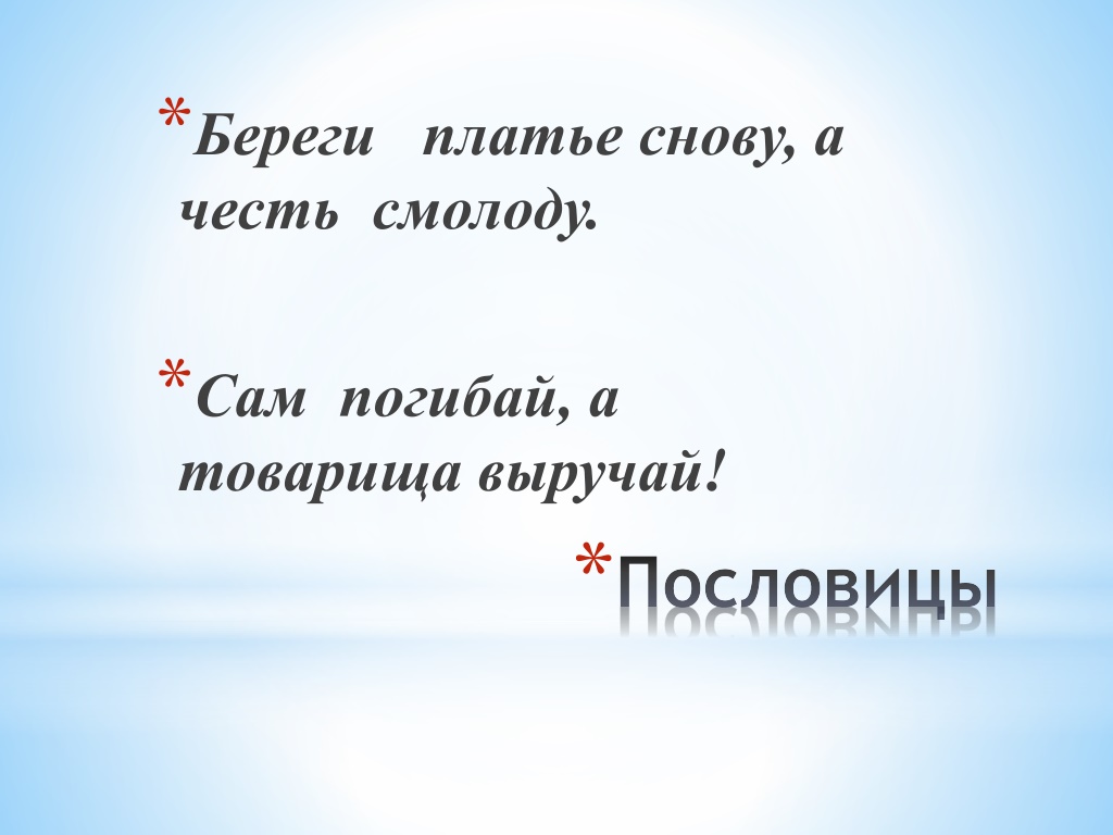 Береги платье снову, а честь смолоду. • Сам погибай, а товарища выручай! Пословицы