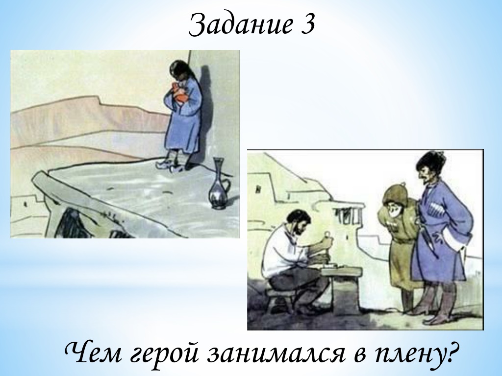 Жилин и Костылин в плену Жилин - высматривает - выпытывает - копает дыру - лепет кукол - плетёт корзины - мастерит игрушечную карусель - чинит оружие, часы - учится понимать татарский язык