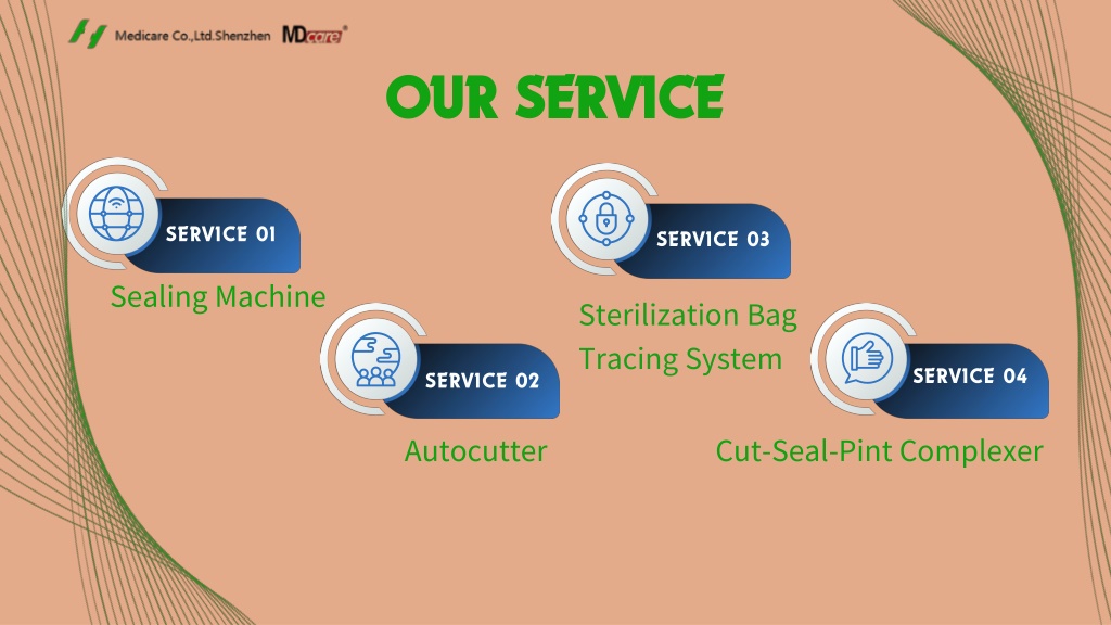 OUR SERVICE SERVICE 01 SERVICE 03 Sealing Machine Sterilization Bag Tracing System SERVICE 04 SERVICE 02 Autocutter Cut-Seal-Pint Complexer