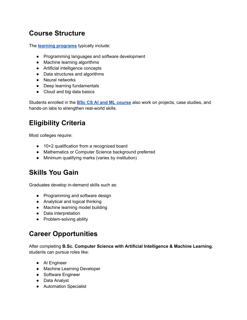 Course Structure The learning programs typically include: ● Programming languages and software development ● Machine learning algorithms ● Artificial intelligence concepts ● Data structures and algorithms ● Neural networks ● Deep learning fundamentals ● Cloud and big data basics Students enrolled in the BSc CS AI and ML course also work on projects, case studies, and hands-on labs to strengthen real-world skills. Eligibility Criteria Most colleges require: ● 10+2 qualification from a recognized board ● Mathematics or Computer Science background preferred ● Minimum qualifying marks (varies by institution) Skills You Gain Graduates develop in-demand skills such as: ● Programming and software design ● Analytical and logical thinking ● Machine learning model building ● Data interpretation ● Problem-solving ability Career Opportunities After completing B.Sc. Computer Science with Artificial Intelligence & Machine Learning, students can pursue roles like: ● AI Engineer ● Machine Learning Developer ● Software Engineer ● Data Analyst ● Automation Specialist