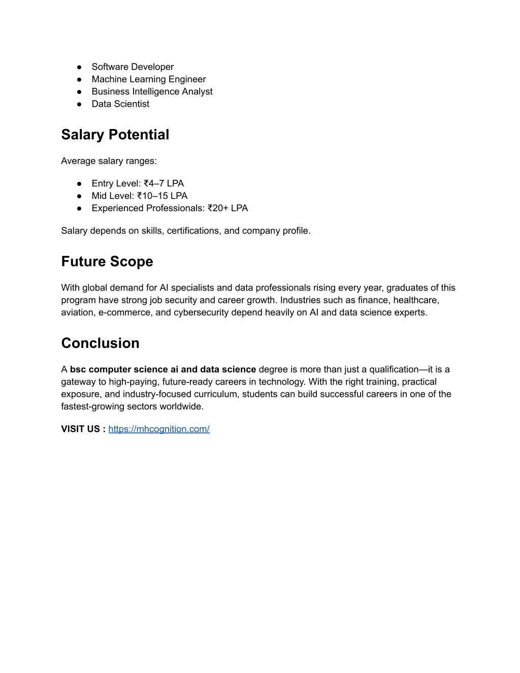 ● Software Developer ● Machine Learning Engineer ● Business Intelligence Analyst ● Data Scientist Salary Potential Average salary ranges: ● Entry Level: ₹4–7 LPA ● Mid Level: ₹10–15 LPA ● Experienced Professionals: ₹20+ LPA Salary depends on skills, certifications, and company profile. Future Scope With global demand for AI specialists and data professionals rising every year, graduates of this program have strong job security and career growth. Industries such as finance, healthcare, aviation, e-commerce, and cybersecurity depend heavily on AI and data science experts. Conclusion A bsc computer science ai and data science degree is more than just a qualification—it is a gateway to high-paying, future-ready careers in technology. With the right training, practical exposure, and industry-focused curriculum, students can build successful careers in one of the fastest-growing sectors worldwide. VISIT US : https://mhcognition.com/