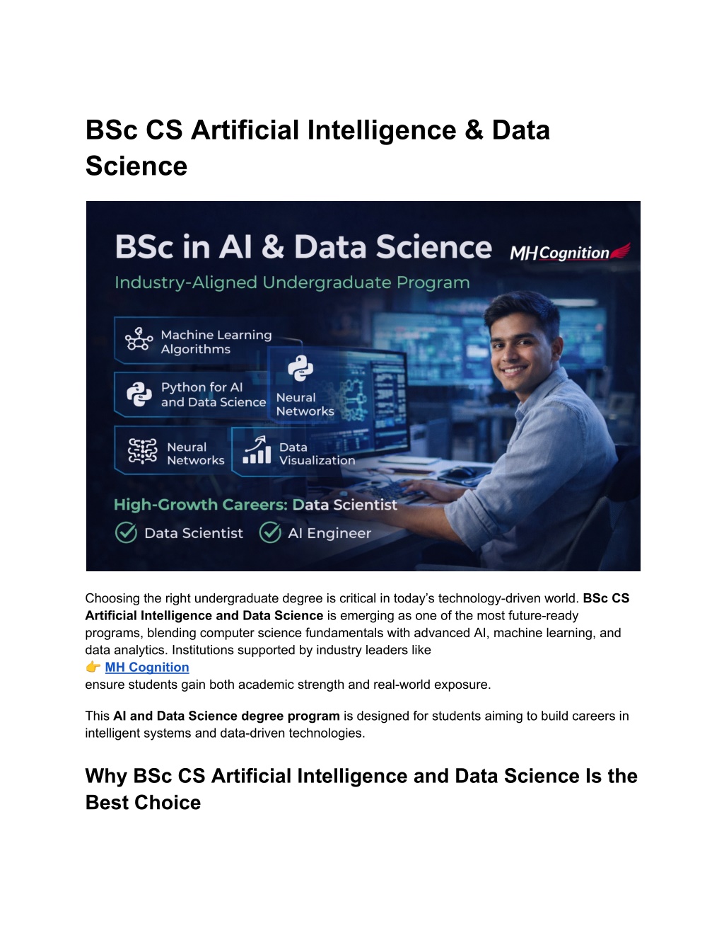 ● BSc CS AI DS syllabus PDF ● BSc AI DS course details ● BSc artificial intelligence and data science fees Many of these details are structured clearly in programs supported by ?MH Cognition’s BSc CS AI & DS learning framework Why AI and Data Science Are Essential for the Next Decade AI and data science are driving Industry 4.0, automation, and intelligent decision-making. An AI and Data Science degree program equips students with future-proof skills required to stay competitive in a rapidly evolving job market. Programs backed by industry-aligned partners like MH Cognition ensure graduates are not just degree holders—but skilled professionals. Final Thoughts The BSc CS Artificial Intelligence and Data Science program is an ideal choice for students seeking a high-growth, future-oriented career. With a strong academic foundation, hands-on learning, and industry exposure through ?MH Cognition and ?BSc CS AI & DS Program Page, students gain a competitive edge in AI, machine learning, and data science careers.