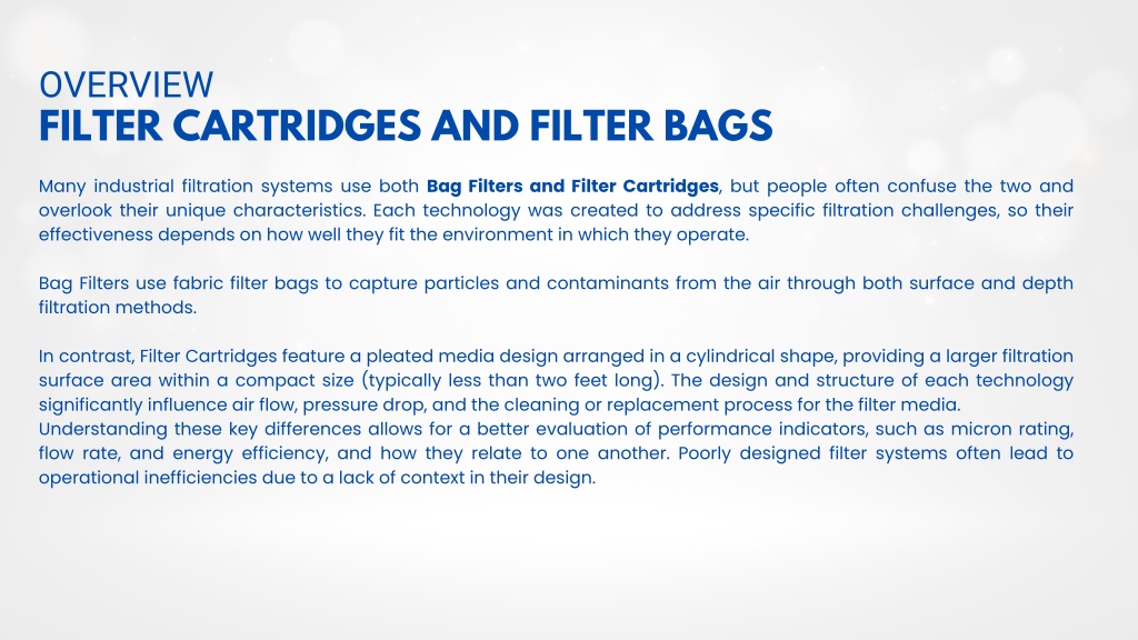 OVERVIEW FILTER CARTRIDGES AND FILTER BAGS Many industrial filtration systems use both Bag Filters and Filter Cartridges, but people often confuse the two and overlook their unique characteristics. Each technology was created to address specific filtration challenges, so their effectiveness depends on how well they fit the environment in which they operate. Bag Filters use fabric filter bags to capture particles and contaminants from the air through both surface and depth filtration methods. In contrast, Filter Cartridges feature a pleated media design arranged in a cylindrical shape, providing a larger filtration surface area within a compact size (typically less than two feet long). The design and structure of each technology significantly influence air flow, pressure drop, and the cleaning or replacement process for the filter media. Understanding these key differences allows for a better evaluation of performance indicators, such as micron rating, flow rate, and energy efficiency, and how they relate to one another. Poorly designed filter systems often lead to operational inefficiencies due to a lack of context in their design.