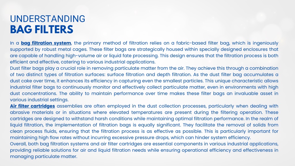 UNDERSTANDING BAG FILTERS In a bag filtration system, the primary method of filtration relies on a fabric-based filter bag, which is ingeniously supported by robust metal cages. These filter bags are strategically housed within specially designed enclosures that are capable of handling high-volume air or liquid fate processing. This design ensures that the filtration process is both efficient and effective, catering to various industrial applications. Dust filter bags play a crucial role in removing particulate matter from the air. They achieve this through a combination of two distinct types of filtration surfaces: surface filtration and depth filtration. As the dust filter bag accumulates a dust cake over time, it enhances its efficiency in capturing even the smallest particles. This unique characteristic allows industrial filter bags to continuously monitor and effectively collect particulate matter, even in environments with high dust concentrations. The ability to maintain performance over time makes these filter bags an invaluable asset in various industrial settings. Air filter cartridges assemblies are often employed in the dust collection processes, particularly when dealing with abrasive materials or in situations where elevated temperatures are present during the filtering operation. These cartridges are designed to withstand harsh conditions while maintaining optimal filtration performance. In the realm of liquid filtration, the implementation of filtration bags is equally significant. They facilitate the removal of solids from clean process fluids, ensuring that the filtration process is as effective as possible. This is particularly important for maintaining high flow rates without incurring excessive pressure drops, which can hinder system efficiency. Overall, both bag filtration systems and air filter cartridges are essential components in various industrial applications, providing reliable solutions for air and liquid filtration needs while ensuring operational efficiency and effectiveness in managing particulate matter.