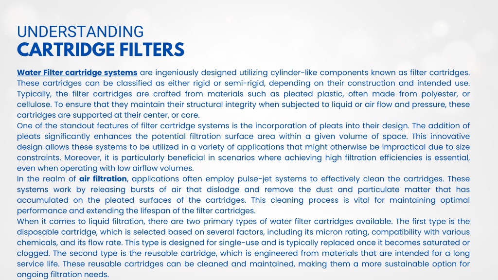 UNDERSTANDING CARTRIDGE FILTERS Water Filter cartridge systems are ingeniously designed utilizing cylinder-like components known as filter cartridges. These cartridges can be classified as either rigid or semi-rigid, depending on their construction and intended use. Typically, the filter cartridges are crafted from materials such as pleated plastic, often made from polyester, or cellulose. To ensure that they maintain their structural integrity when subjected to liquid or air flow and pressure, these cartridges are supported at their center, or core. One of the standout features of filter cartridge systems is the incorporation of pleats into their design. The addition of pleats significantly enhances the potential filtration surface area within a given volume of space. This innovative design allows these systems to be utilized in a variety of applications that might otherwise be impractical due to size constraints. Moreover, it is particularly beneficial in scenarios where achieving high filtration efficiencies is essential, even when operating with low airflow volumes. In the realm of air filtration, applications often employ pulse-jet systems to effectively clean the cartridges. These systems work by releasing bursts of air that dislodge and remove the dust and particulate matter that has accumulated on the pleated surfaces of the cartridges. This cleaning process is vital for maintaining optimal performance and extending the lifespan of the filter cartridges. When it comes to liquid filtration, there are two primary types of water filter cartridges available. The first type is the disposable cartridge, which is selected based on several factors, including its micron rating, compatibility with various chemicals, and its flow rate. This type is designed for single-use and is typically replaced once it becomes saturated or clogged. The second type is the reusable cartridge, which is engineered from materials that are intended for a long service life. These reusable cartridges can be cleaned and maintained, making them a more sustainable option for ongoing filtration needs.