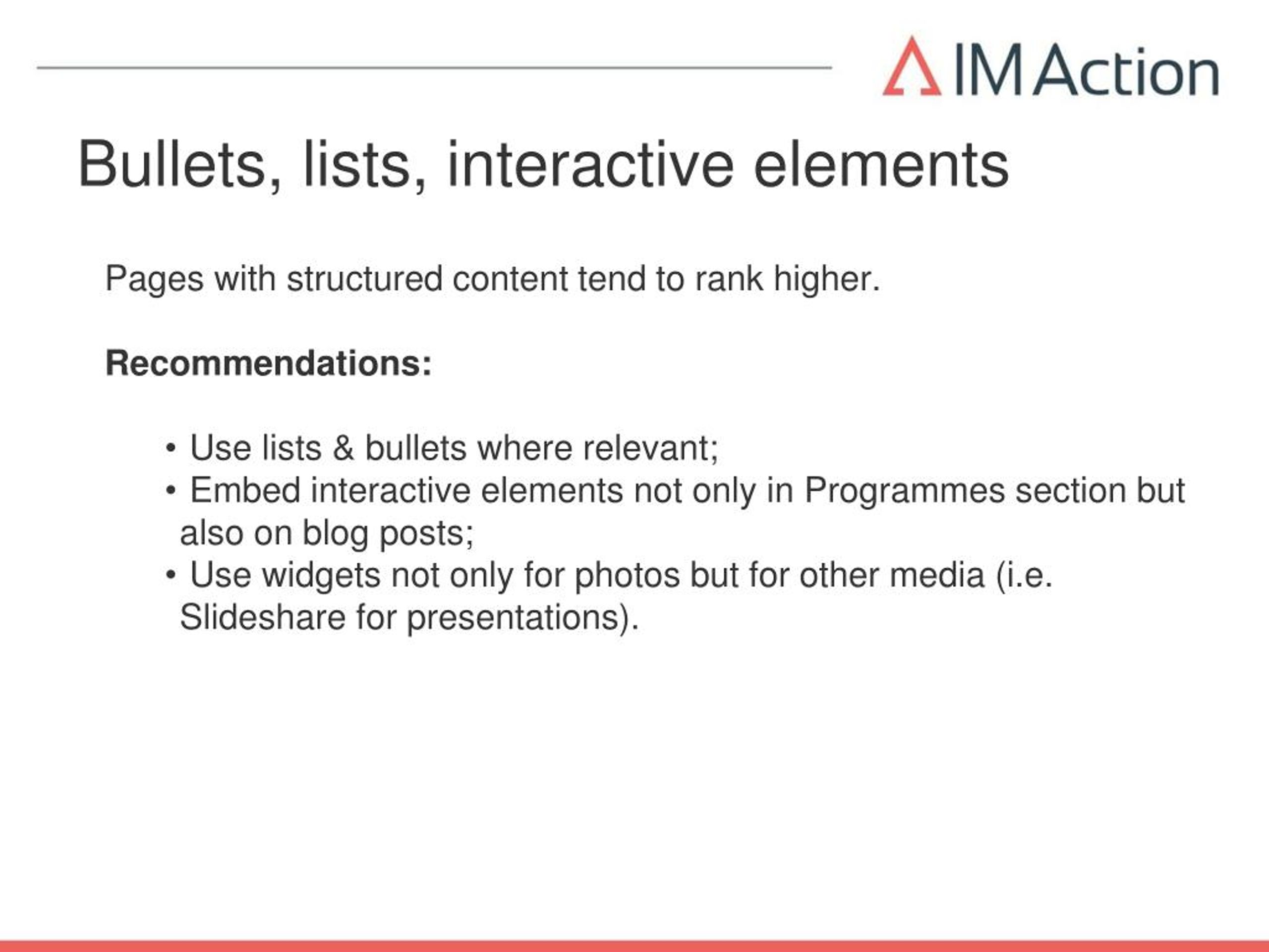 Bullets, lists, interactive elements Pages with structured content tend to rank higher. Recommendations: • Use lists & bullets where relevant; • Embed interactive elements not only in Programmes section but also on blogposts; • Use widgets not only for photos but for other media (i.e. Slideshare for presentations).