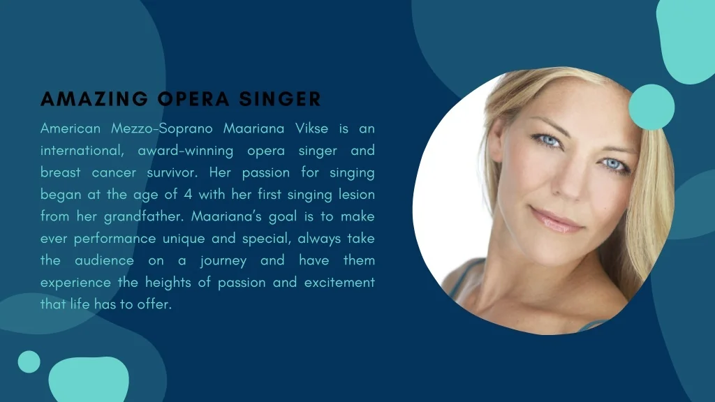 AMAZING OPERA SINGER American Mezzo-Soprano Maariana Vikse is an international, award-winning opera singer and breast cancer survivor. Her passion for singing began at the age of 4 with her first singing lesion from her grandfather. Maariana’s goal is to make ever performance unique and special, always take the audience on a journey and have them experience the heights of passion and excitement that life has to offer.