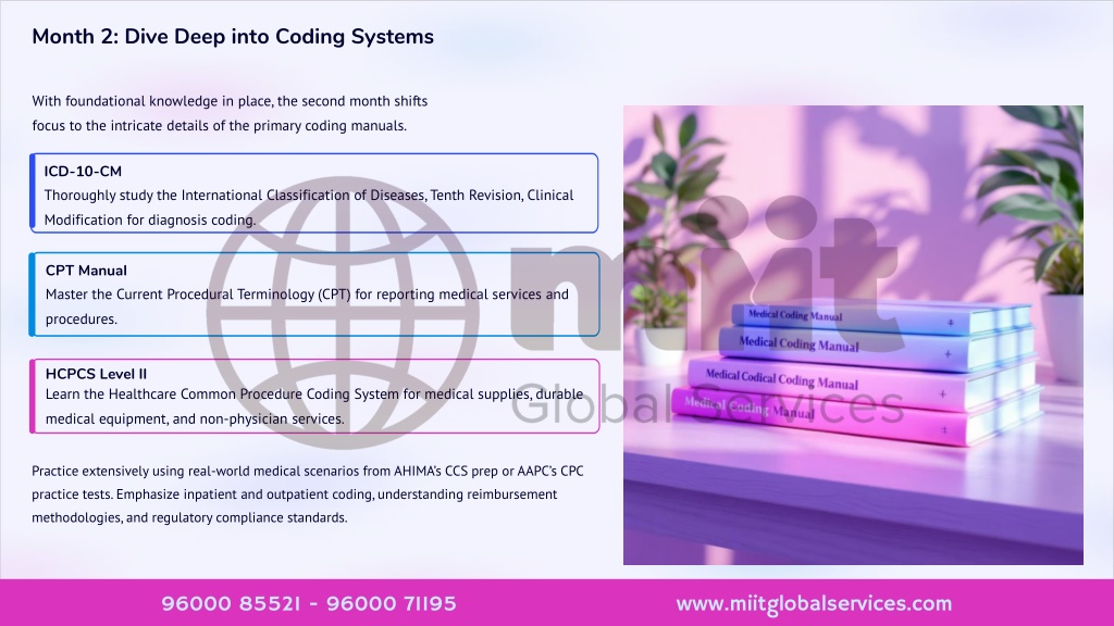 Month 2: Dive Deep into Coding Systems With foundational knowledge in place, the second month shifts focus to the intricate details of the primary coding manuals. ICD-10-CM Thoroughly study the International Classification of Diseases, Tenth Revision, Clinical Modification for diagnosis coding. CPT Manual Master the Current Procedural Terminology (CPT) for reporting medical services and procedures. HCPCS Level II Learn the Healthcare Common Procedure Coding System for medical supplies, durable medical equipment, and non-physician services. Practice extensively using real-world medical scenarios from AHIMA’s CCS prep or AAPC’s CPC practice tests. Emphasize inpatient and outpatient coding, understanding reimbursement methodologies, and regulatory compliance standards. 96000 85521 - 96000 71195 www.miitglobalservices.com