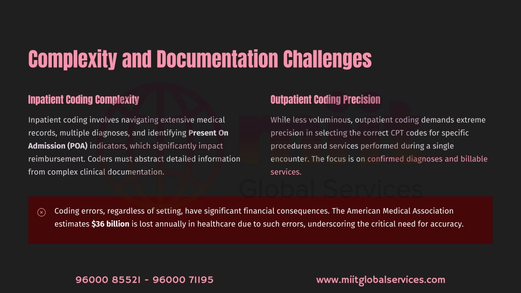 Complexity and Documentation Challenges Inpatient Coding Complexity Outpatient Coding Precision Inpatient coding involves navigating extensive medical records, multiple diagnoses, and identifying Present On Admission (POA) indicators, which significantly impact reimbursement. Coders must abstract detailed information from complex clinical documentation. While less voluminous, outpatient coding demands extreme precision in selecting the correct CPT codes for specific procedures and services performed during a single encounter. The focus is on confirmed diagnoses and billable services. Coding errors, regardless of setting, have significant financial consequences. The American Medical Association estimates $36 billion is lost annually in healthcare due to such errors, underscoring the critical need for accuracy. 96000 85521 - 96000 71195 www.miitglobalservices.com