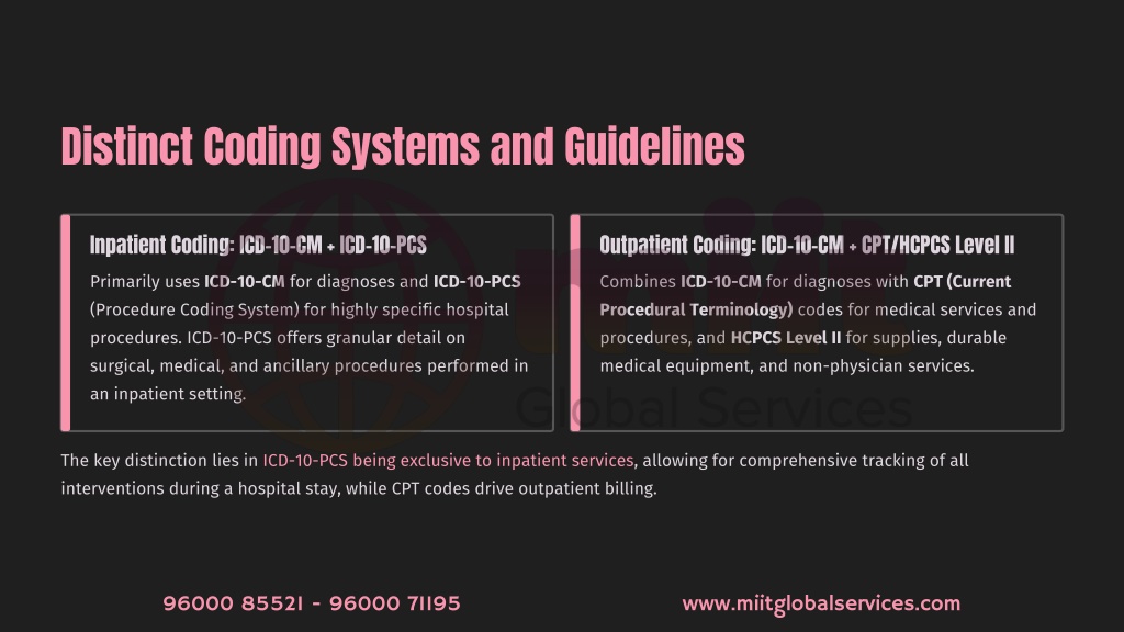 Conclusion: Mastering Both for Healthcare Success Understanding the distinctions between inpatient and outpatient medical coding is fundamental for accurate billing, regulatory compliance, and robust revenue cycles in any healthcare organization. • Both specializations demand rigorous attention to detail and a commitment to continuous learning. • Evolving healthcare regulations and coding guidelines require coders to stay updated through ongoing education and professional development. • Skilled medical coders, whether focused on inpatient or outpatient settings, are the backbone of efficient healthcare operations, directly contributing to both patient care and financial stability. Invest in your coding expertise – it's an investment in the future of healthcare. 96000 85521 - 96000 71195 www.miitglobalservices.com