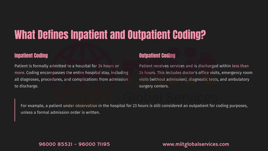What Defines Inpatient and Outpatient Coding? Inpatient Coding Outpatient Coding Patient is formally admitted to a hospital for 24 hours or more. Coding encompasses the entire hospital stay, including all diagnoses, procedures, and complications from admission to discharge. Patient receives services and is discharged within less than 24 hours. This includes doctor's office visits, emergency room visits (without admission), diagnostic tests, and ambulatory surgery centers. For example, a patient under observation in the hospital for 23 hours is still considered an outpatient for coding purposes, unless a formal admission order is written. 96000 85521 - 96000 71195 www.miitglobalservices.com