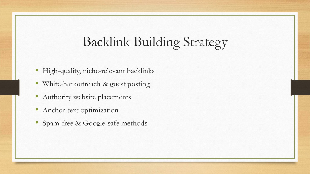 6. Backlink Building Strategy • High-quality, niche-relevant backlinks • White-hat outreach & guest posting • Authority website placements • Anchor text optimization • Spam-free & Google-safe methods