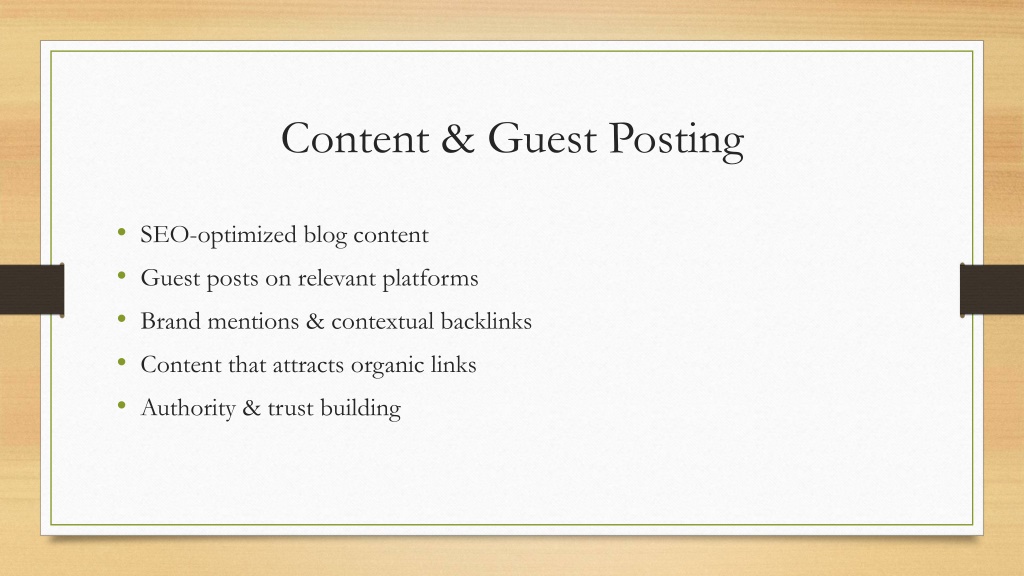 7. Content & Guest Posting • SEO-optimized blog content • Guest posts on relevant platforms • Brand mentions & contextual backlinks • Content that attracts organic links • Authority & trust building