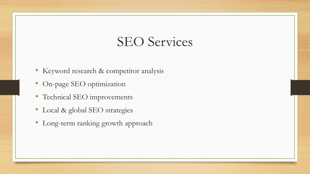 5. SEO Services • Keyword research & competitor analysis • On-page SEO optimization • Technical SEO improvements • Local & global SEO strategies • Long-term ranking growth approach