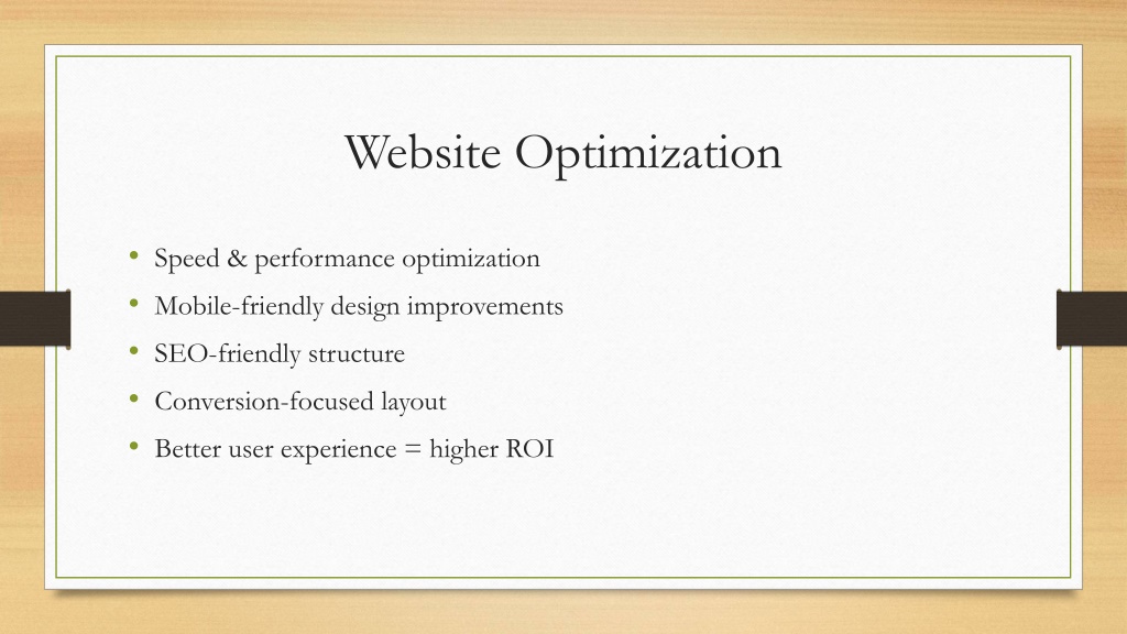 9. Website Optimization • Speed & performance optimization • Mobile-friendly design improvements • SEO-friendly structure • Conversion-focused layout • Better user experience = higher ROI