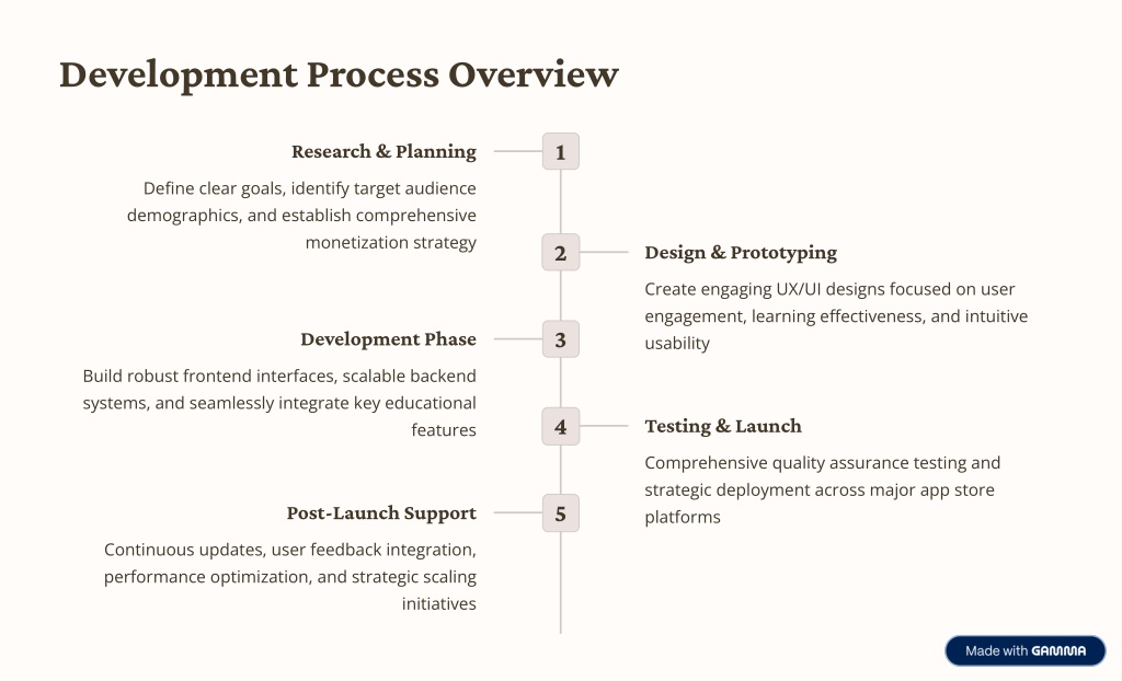 Development Process Overview 1 Research & Planning Define clear goals, identify target audience demographics, and establish comprehensive monetization strategy 2 Design & Prototyping Create engaging UX/UI designs focused on user engagement, learning effectiveness, and intuitive usability 3 Development Phase Build robust frontend interfaces, scalable backend systems, and seamlessly integrate key educational 4 Testing & Launch features Comprehensive quality assurance testing and strategic deployment across major app store platforms 5 Post-Launch Support Continuous updates, user feedback integration, performance optimization, and strategic scaling initiatives