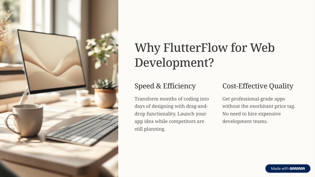 Why FlutterFlow for Web Development? Speed & Efficiency Cost-Effective Quality Transform months of coding into days of designing with drag-and- drop functionality. Launch your app idea while competitors are still planning. Get professional-grade apps without the exorbitant price tag. No need to hire expensive development teams.