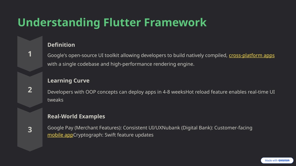 Understanding Flutter Framework Definition Google's open-source UI toolkit allowing developers to build natively compiled, cross-platform apps with a single codebase and high-performance rendering engine. Learning Curve Developers with OOP concepts can deploy apps in 4-8 weeksHot reload feature enables real-time UI tweaks Real-World Examples Google Pay (Merchant Features): Consistent UI/UXNubank (Digital Bank): Customer-facing mobile appCryptograph: Swift feature updates