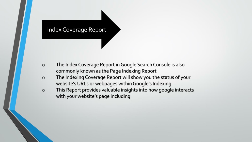 Index Coverage Report • The Index Coverage Report in Google Search Console is also commonly known as the Page Indexing Report • The Indexing Coverage Report will show you the status of your website’s URLs or webpages within Google’s Indexing • This Report provides valuable insights into how google interacts with your website’s page including