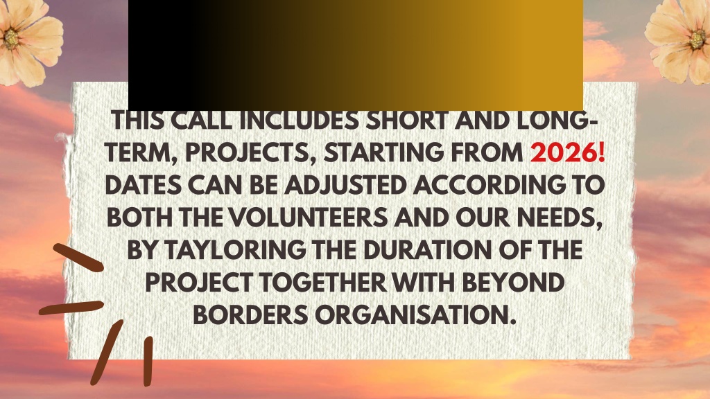 THE PROJECTS - DATES THIS CALL INCLUDES SHORT AND LONG- TERM, PROJECTS, STARTING FROM 2026! DATES CAN BE ADJUSTED ACCORDING TO BOTH THE VOLUNTEERS AND OUR NEEDS, BY TAYLORING THE DURATION OF THE PROJECT TOGETHER WITH BEYOND BORDERS ORGANISATION.