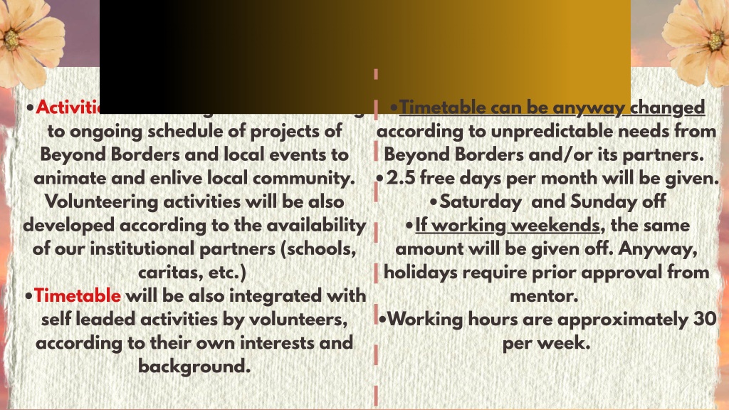 THE PROJECTS - TIMETABLE •Activities will be organized according to ongoing schedule of projects of Beyond Borders and local events to animate and enlive local community. Volunteering activities will be also developed according to the availability of our institutional partners (schools, caritas, etc.) •Timetable will be also integrated with self leaded activities by volunteers, according to their own interests and background. •Timetable can be anyway changed according to unpredictable needs from Beyond Borders and/or its partners. •2.5 free days per month will be given. •Saturday and Sunday off •If working weekends, the same amount will be given off. Anyway, holidays require prior approval from mentor. •Working hours are approximately 30 per week.