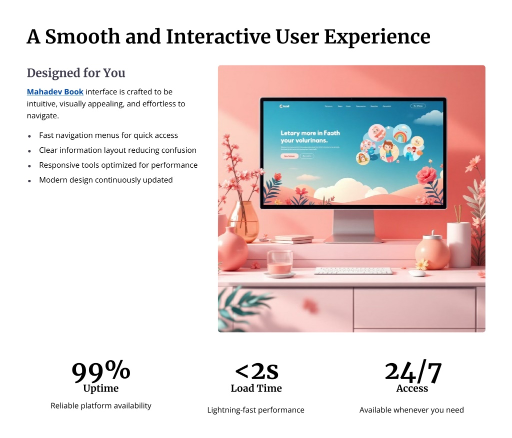 A Smooth and Interactive User Experience DesignedforYou Mahadev Book interface is crafted to be intuitive, visually appealing, and effortless to navigate. Fast navigation menus for quick access Clear information layout reducing confusion Responsive tools optimized for performance Modern design continuously updated 99% Uptime <2s Load Time 24/7 Access Reliable platform availability Lightning-fast performance Available whenever you need