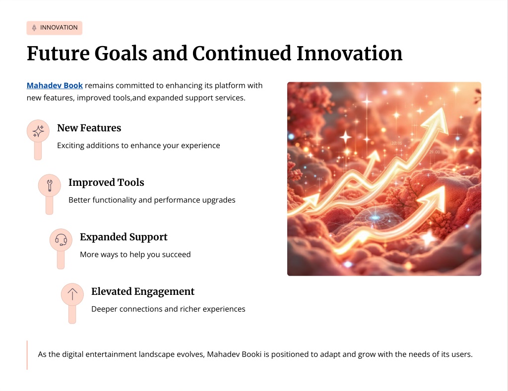 INNOVATION Future Goals and Continued Innovation Mahadev Book remains committed to enhancing its platform with new features, improved tools,and expanded support services. New Features Exciting additions to enhance your experience Improved Tools Better functionality and performance upgrades Expanded Support More ways to help you succeed Elevated Engagement Deeper connections and richer experiences As the digital entertainment landscape evolves, Mahadev Booki is positioned to adapt and grow with the needs of its users.