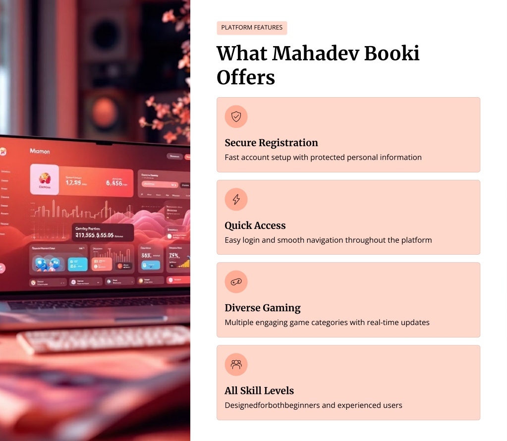 PLATFORM FEATURES What Mahadev Booki Offers Secure Registration Fast account setup with protected personal information Quick Access Easy login and smooth navigation throughout the platform Diverse Gaming Multiple engaging game categories with real-time updates All Skill Levels Designedforbothbeginners and experienced users