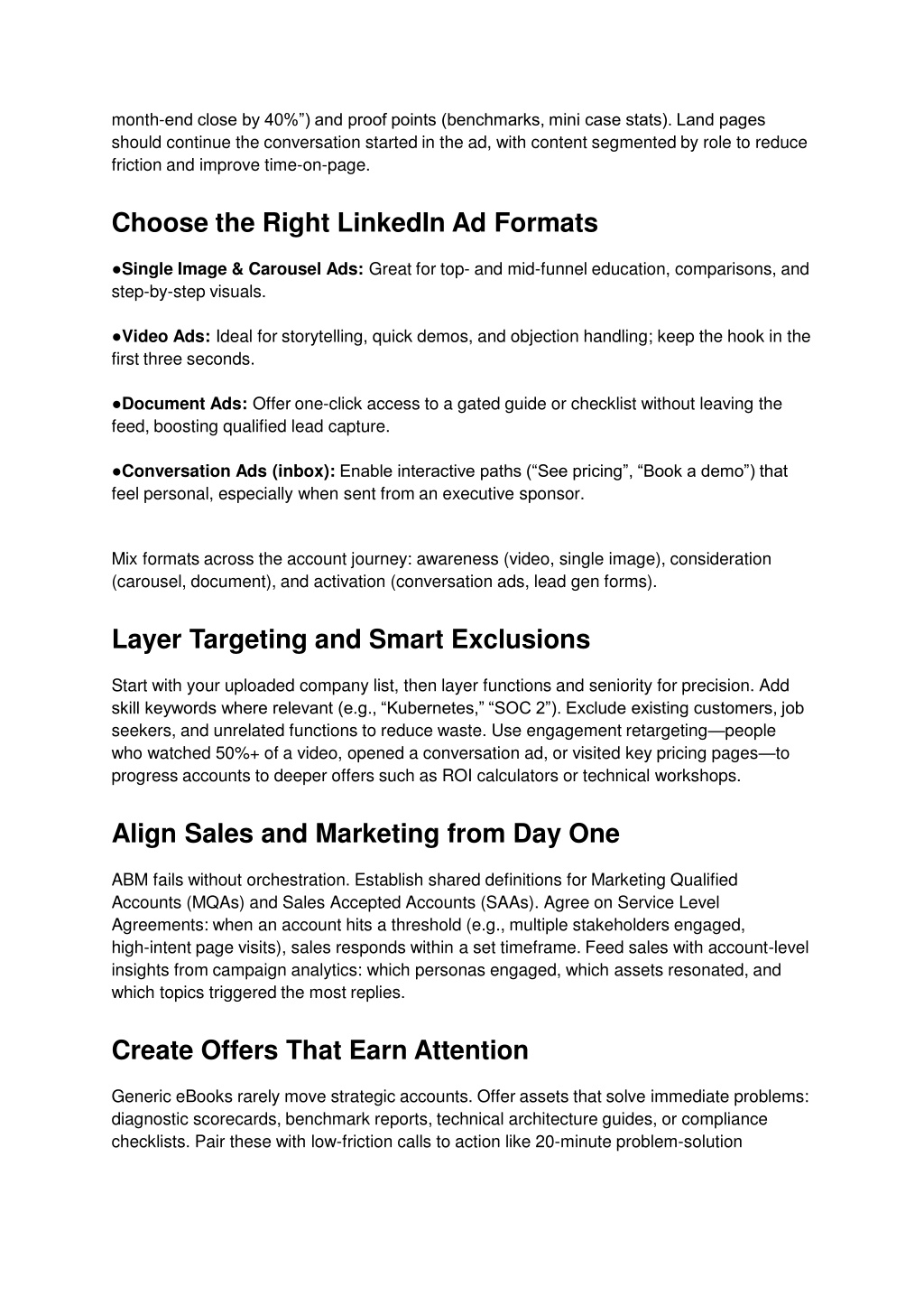 month-end close by 40%”) and proof points (benchmarks, mini case stats). Land pages should continue the conversation started in the ad, with content segmented by role to reduce friction and improve time-on-page. • Choose the Right LinkedIn Ad Formats • Single Image & Carousel Ads: Great for top- and mid-funnel education, comparisons, and step-by-step visuals. • Video Ads: Ideal for storytelling, quick demos, and objection handling; keep the hook in the first three seconds. • Document Ads: Offer one-click access to a gated guide or checklist without leaving the feed, boosting qualified lead capture. • Conversation Ads (inbox): Enable interactive paths (“See pricing”, “Book a demo”) that feel personal, especially when sent from an executive sponsor. • Mix formats across the account journey: awareness (video, single image), consideration (carousel, document), and activation (conversation ads, lead gen forms). • Layer Targeting and Smart Exclusions • Start with your uploaded company list, then layer functions and seniority for precision. Add skill keywords where relevant (e.g., “Kubernetes,” “SOC 2”). Exclude existing customers, job seekers, and unrelated functions to reduce waste. Use engagement retargeting—people who watched 50%+ of a video, opened a conversation ad, or visited key pricing pages—to progress accounts to deeper offers such as ROI calculators or technical workshops. • Align Sales and Marketing from Day One • ABM fails without orchestration. Establish shared definitions for Marketing Qualified Accounts (MQAs) and Sales Accepted Accounts (SAAs). Agree on Service Level Agreements: when an account hits a threshold (e.g., multiple stakeholders engaged, • high-intent page visits), sales responds within a set timeframe. Feed sales with account-level insights from campaign analytics: which personas engaged, which assets resonated, and which topics triggered the most replies. • Create Offers That Earn Attention • Generic eBooks rarely move strategic accounts. Offer assets that solve immediate problems: diagnostic scorecards, benchmark reports, technical architecture guides, or compliance checklists. Pair these with low-friction calls to action like 20-minute problem-solution