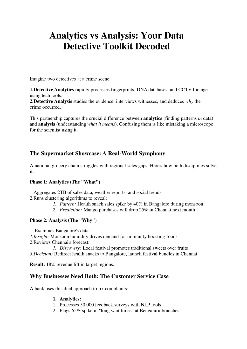 Analytics vs Analysis: Your Data Detective Toolkit Decoded Imagine two detectives at a crime scene: Detective Analytics rapidly processes fingerprints, DNA databases, and CCTV footage using tech tools. Detective Analysis studies the evidence, interviews witnesses, and deduces why the crime occurred. This partnership captures the crucial difference between analytics (finding patterns in data) and analysis (understanding what it means). Confusing them is like mistaking a microscope for the scientist using it. • The Supermarket Showcase: A Real-World Symphony • A national grocery chain struggles with regional sales gaps. Here's how both disciplines solve it: • Phase 1: Analytics (The "What") • Aggregates 2TB of sales data, weather reports, and social trends • Runs clustering algorithms to reveal: • Pattern: Health snack sales spike by 40% in Bangalore during monsoon • Prediction: Mango purchases will drop 25% in Chennai next month • Phase 2: Analysis (The "Why") • 1. Examines Bangalore's data: • Insight: Monsoon humidity drives demand for immunity-boosting foods • Reviews Chennai's forecast: • Discovery: Local festival promotes traditional sweets over fruits • Decision: Redirect health snacks to Bangalore, launch festival bundles in Chennai • Result: 18% revenue lift in target regions. • Why Businesses Need Both: The Customer Service Case • A bank uses this dual approach to fix complaints: • Analytics: • Processes 50,000 feedback surveys with NLP tools • Flags 65% spike in "long wait times" at Bengaluru branches