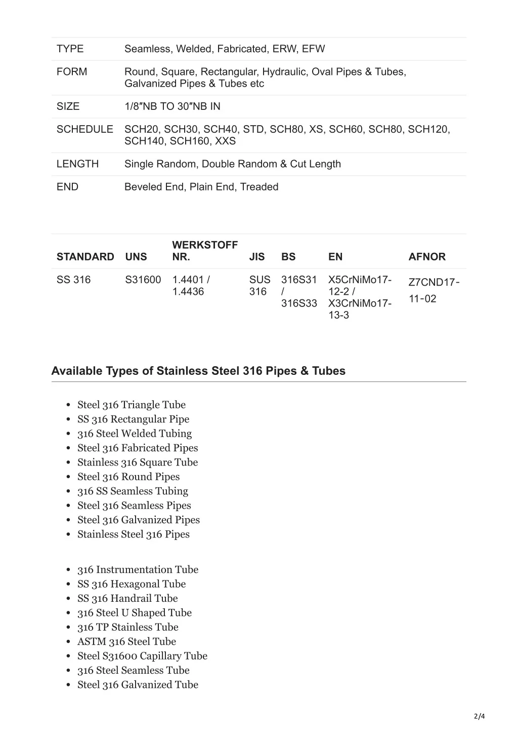 TYPE Seamless, Welded, Fabricated, ERW, EFW FORM Round, Square, Rectangular, Hydraulic, Oval Pipes & Tubes, Galvanized Pipes & Tubes etc SIZE 1/8″NB TO 30″NB IN SCHEDULE SCH20, SCH30, SCH40, STD, SCH80, XS, SCH60, SCH80, SCH120, SCH140, SCH160, XXS LENGTH Single Random, Double Random & Cut Length END Beveled End, Plain End, Treaded WERKSTOFF NR. STANDARD UNS JIS BS EN AFNOR SS 316 S31600 1.4401 / 1.4436 SUS 316 316S31 / 316S33 X5CrNiMo17- 12-2 / X3CrNiMo17- 13-3 Z7CND17‐ 11‐02 Available Types of Stainless Steel 316 Pipes & Tubes Steel 316 Triangle Tube SS 316 Rectangular Pipe 316 Steel Welded Tubing Steel 316 Fabricated Pipes Stainless 316 Square Tube Steel 316 Round Pipes 316 SS Seamless Tubing Steel 316 Seamless Pipes Steel 316 Galvanized Pipes Stainless Steel 316 Pipes 316 Instrumentation Tube SS 316 Hexagonal Tube SS 316 Handrail Tube 316 Steel U Shaped Tube 316 TP Stainless Tube ASTM 316 Steel Tube Steel S31600 Capillary Tube 316 Steel Seamless Tube Steel 316 Galvanized Tube 2/4