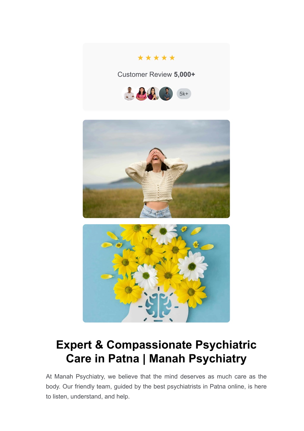 ★ ★ ★ ★ ★ Customer Review 5,000+ 5k+ Expert & Compassionate Psychiatric Care in Patna | Manah Psychiatry At Manah Psychiatry, we believe that the mind deserves as much care as the body. Our friendly team, guided by the best psychiatrists in Patna online, is here to listen, understand, and help.