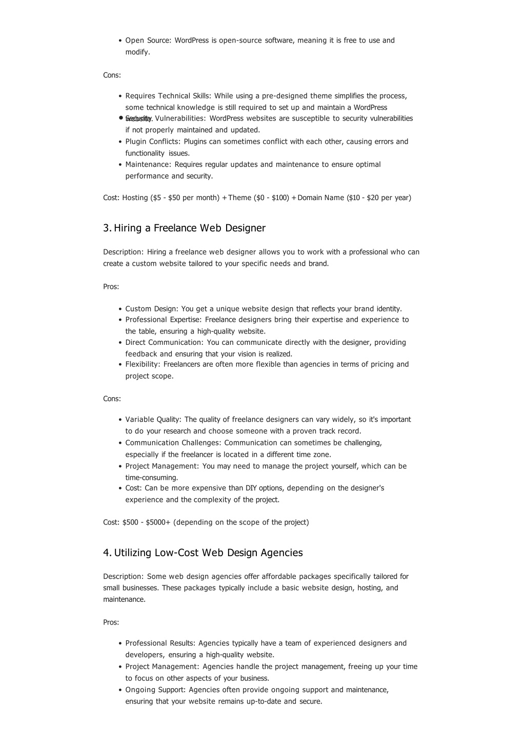 3. OpenSource:WordPressisopen-sourcesoftware,meaningitisfreetouseand modify. • Cons: • RequiresTechnicalSkills:Whileusingapre-designedthemesimplifiestheprocess, sometechnicalknowledgeisstillrequiredto setupand maintainaWordPress • Sweecbusriittey.Vulnerabilities:WordPresswebsitesaresusceptibletosecurityvulnerabilitiesifnotproperlymaintainedandupdated. • PluginConflicts:Pluginscan sometimesconflictwith each other,causingerrorsand functionalityissues. • Maintenance:Requiresregularupdatesandmaintenancetoensureoptimal • performanceandsecurity. • Cost:Hosting($5-$50permonth)+Theme($0-$100)+DomainName($10-$20peryear) • HiringaFreelanceWeb Designer • Description:Hiringafreelancewebdesignerallowsyouto workwithaprofessionalwhocan createacustomwebsitetailoredtoyourspecificneedsandbrand. • Pros: • CustomDesign:Yougetauniquewebsitedesignthatreflectsyourbrandidentity. • ProfessionalExpertise:Freelancedesignersbringtheirexpertiseandexperienceto thetable,ensuringahigh-qualitywebsite. • DirectCommunication:Youcancommunicatedirectlywiththedesigner,providing • feedbackandensuringthatyourvisionisrealized. • Flexibility:Freelancersare often more flexiblethanagenciesintermsofpricingand projectscope. • Cons: • VariableQuality:Thequalityof freelancedesignerscan varywidely,soit'simportant todoyourresearchandchoosesomeonewithaproven trackrecord. • CommunicationChallenges:Communicationcansometimesbechallenging, especiallyifthefreelancerislocatedinadifferenttimezone. • ProjectManagement:Youmayneedtomanagetheprojectyourself,which canbe • time-consuming. • Cost:Can bemoreexpensive thanDIYoptions,dependingonthedesigner's experience andthecomplexityoftheproject. • Cost:$500-$5000+(dependingonthescopeoftheproject) • UtilizingLow-CostWebDesignAgencies • Description:Some webdesignagenciesofferaffordablepackagesspecificallytailoredfor smallbusinesses.Thesepackagestypicallyincludeabasicwebsitedesign,hosting,and maintenance. • Pros: • ProfessionalResults:Agenciestypicallyhaveateamofexperienceddesignersand developers,ensuringahigh-qualitywebsite. • ProjectManagement:Agencieshandletheprojectmanagement,freeingupyourtime to focusonotheraspects ofyourbusiness. • OngoingSupport:Agenciesoftenprovideongoingsupportandmaintenance, • ensuringthatyourwebsiteremainsup-to-dateandsecure.