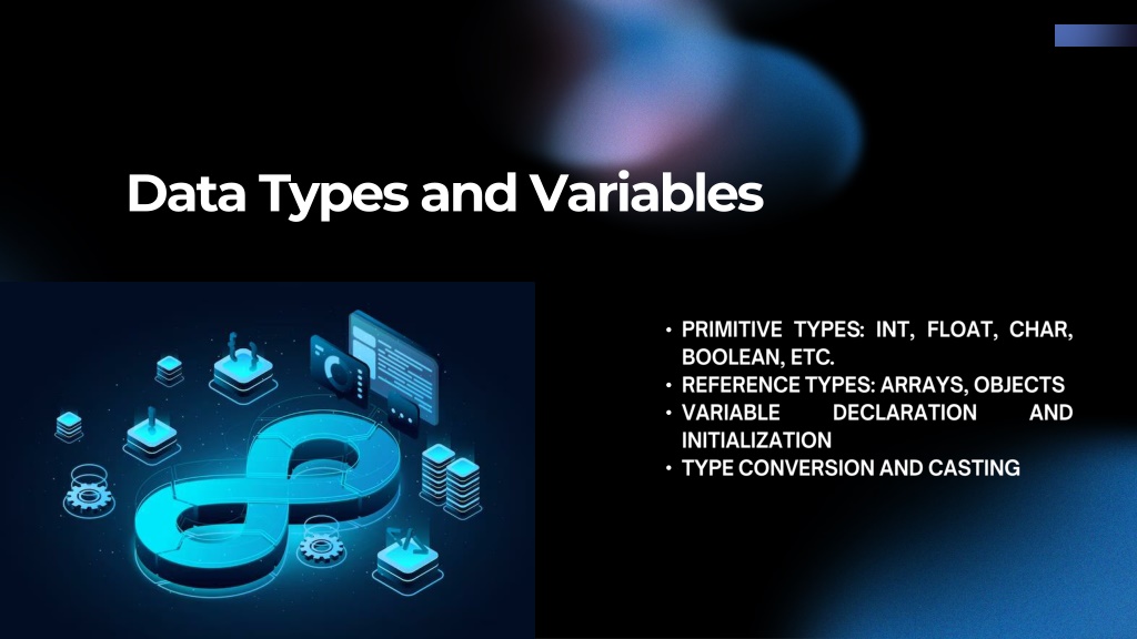 Data Types and Variables • PRIMITIVE TYPES: INT, FLOAT, CHAR, BOOLEAN, ETC. • REFERENCE TYPES: ARRAYS, OBJECTS • VARIABLE DECLARATION AND INITIALIZATION • TYPE CONVERSION AND CASTING