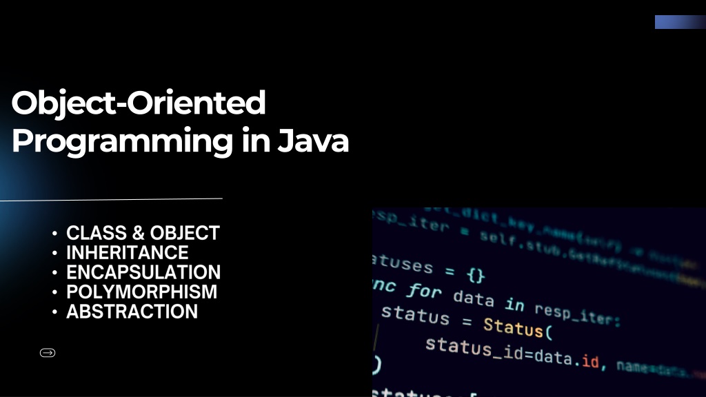 Object-Oriented Programming in Java • CLASS & OBJECT • INHERITANCE • ENCAPSULATION • POLYMORPHISM • ABSTRACTION