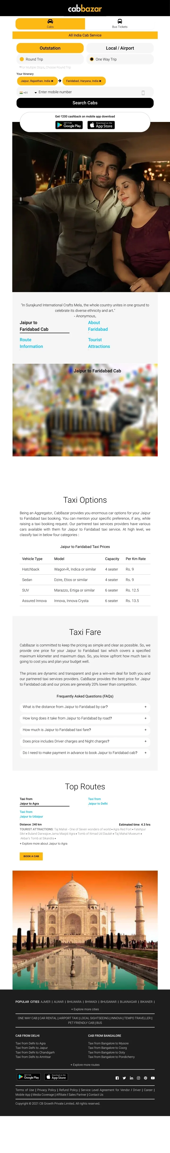 Cabs Bus Tickets All India Cab Service Outstation Local / Airport Round Trip One Way Trip *For Multiple Stops, Choose Round Trip Your Itinerary Jaipur, Rajasthan, India Faridabad, Haryana, India Enter mobile number ?+91 Search Cabs Get ₹200 cashback on mobile app download "In Surajkund International Crafts Mela, the whole country unites in one ground to celebrate its diverse ethnicity and art." - Anonymous, Jaipur to Faridabad Cab About Faridabad Route Information Tourist Attractions Jaipur to Faridabad Cab Taxi Options Being an Aggregator, CabBazar provides you enormous car options for your Jaipur to Faridabad taxi booking. You can mention your specific preference, if any, while raising a taxi booking request. Our partnered taxi services providers have various cars available with them for Jaipur to Faridabad taxi service. At high level, we classify taxi in below four categories : Jaipur to Faridabad Taxi Prices Vehicle Type Model Capacity Per Km Rate Hatchback Wagon-R, Indica or similar 4 seater Rs. 9 Sedan Dzire, Etios or similar 4 seater Rs. 9 SUV Marazzo, Ertiga or similar 6 seater Rs. 12.5 Assured Innova Innova, Innova Crysta 6 seater Rs. 13.5 Taxi Fare CabBazar is committed to keep the pricing as simple and clear as possible. So, we provide one price for your Jaipur to Faridabad taxi which covers a specified maximum kilometer and maximum days. So, you know upfront how much taxi is going to cost you and plan your budget well. The prices are dynamic and transparent and give a win-win deal for both you and our partnered taxi services providers. CabBazar provides the best price for Jaipur to Faridabad cab and our prices are generally 20% lower than competition. Frequently Asked Questions (FAQs) What is the distance from Jaipur to Faridabad by car? + How long does it take from Jaipur to Faridabad by road? + How much is Jaipur to Faridabad taxi fare? + Does price includes Driver charges and Night charges? + Do I need to make payment in advance to book Jaipur to Faridabad cab? + Top Routes Taxi from Jaipur to Agra Taxi from Jaipur to Delhi Taxi from Jaipur to Udaipur Distance: 240 km TOURIST ATTRACTIONS: Taj Mahal - One of Seven wonders of world Agra Red Fort Fatehpur Sikri Buland Darwaja Jama Masjid Agra Tomb of Itimad Ud Daulah Taj Mahal Museum Akbar's Tomb at Sikandra Estimated time: 4.3 hrs + Explore more about Jaipur to Agra BOOK A CAB POPULAR CITIES AJMER | ALWAR | BHILWARA | BHIWADI | BHUSAWAR | BIJAINAGAR | BIKANER | + Explore more cities ONE WAY CAB | CAR RENTAL | AIRPORT TAXI | LOCAL SIGHTSEEING | INNOVA | TEMPO TRAVELLER | PET FRIENDLY CAB | BUS CAB FROM DELHI CAB FROM BANGALORE Taxi from Delhi to Agra Taxi from Delhi to Jaipur Taxi from Delhi to Chandigarh Taxi from Delhi to Amritsar Taxi from Bangalore to Mysore Taxi from Bangalore to Coorg Taxi from Bangalore to Ooty Taxi from Bangalore to Pondicherry + Explore more routes Terms of Use | Privacy Policy | Refund Policy | Service Level Agreement for Vendor / Driver | Career | Mobile App | Media Coverage | Affiliate / Sales Partner | Contact Us Copyright © 2021 CB Growth Private Limited. All rights reserved.