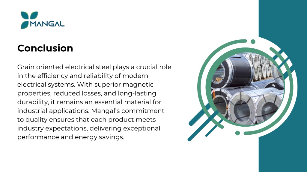 Conclusion Grain oriented electrical steel plays a crucial role in the efficiency and reliability of modern electrical systems. With superior magnetic properties, reduced losses, and long-lasting durability, it remains an essential material for industrial applications. Mangal’s commitment to quality ensures that each product meets industry expectations, delivering exceptional performance and energy savings.
