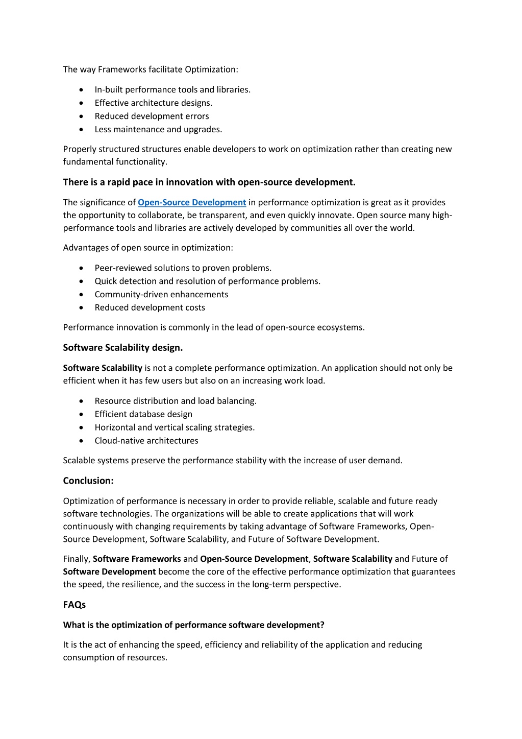 The way Frameworks facilitate Optimization: •In-built performance tools and libraries. •Effective architecture designs. •Reduced development errors •Less maintenance and upgrades. Properly structured structures enable developers to work on optimization rather than creating new fundamental functionality. There is a rapid pace in innovation with open-source development. The significance of Open-Source Development in performance optimization is great as it provides the opportunity to collaborate, be transparent, and even quickly innovate. Open source many high- performance tools and libraries are actively developed by communities all over the world. Advantages of open source in optimization: •Peer-reviewed solutions to proven problems. •Quick detection and resolution of performance problems. •Community-driven enhancements •Reduced development costs Performance innovation is commonly in the lead of open-source ecosystems. Software Scalability design. Software Scalability is not a complete performance optimization. An application should not only be efficient when it has few users but also on an increasing work load. •Resource distribution and load balancing. •Efficient database design •Horizontal and vertical scaling strategies. •Cloud-native architectures Scalable systems preserve the performance stability with the increase of user demand. Conclusion: Optimization of performance is necessary in order to provide reliable, scalable and future ready software technologies. The organizations will be able to create applications that will work continuously with changing requirements by taking advantage of Software Frameworks, Open- Source Development, Software Scalability, and Future of Software Development. Finally, Software Frameworks and Open-Source Development, Software Scalability and Future of Software Development become the core of the effective performance optimization that guarantees the speed, the resilience, and the success in the long-term perspective. FAQs What is the optimization of performance software development? It is the act of enhancing the speed, efficiency and reliability of the application and reducing consumption of resources.
