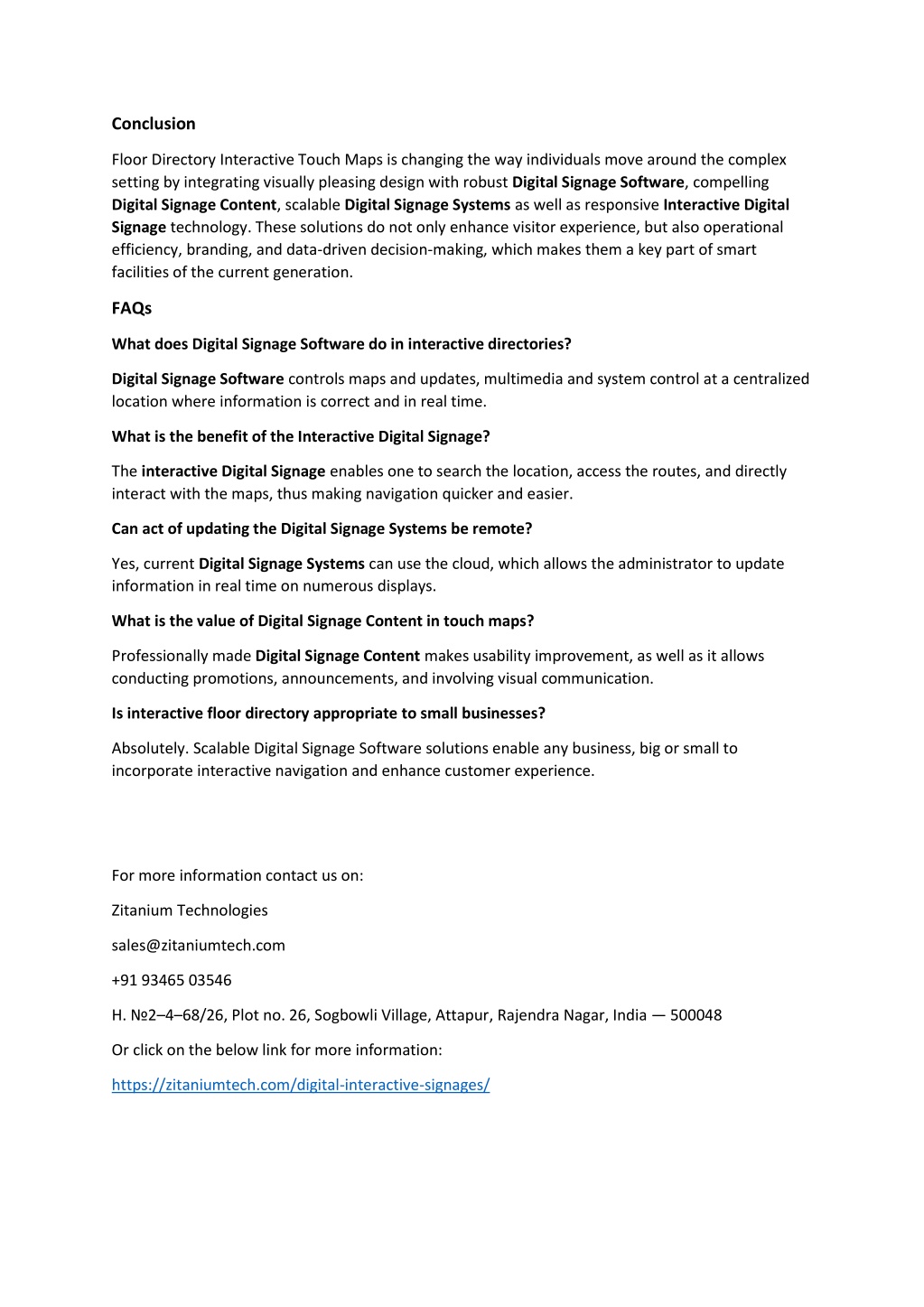 Conclusion Floor Directory Interactive Touch Maps is changing the way individuals move around the complex setting by integrating visually pleasing design with robust Digital Signage Software, compelling Digital Signage Content, scalable Digital Signage Systems as well as responsive Interactive Digital Signage technology. These solutions do not only enhance visitor experience, but also operational efficiency, branding, and data-driven decision-making, which makes them a key part of smart facilities of the current generation. FAQs What does Digital Signage Software do in interactive directories? Digital Signage Software controls maps and updates, multimedia and system control at a centralized location where information is correct and in real time. What is the benefit of the Interactive Digital Signage? The interactive Digital Signage enables one to search the location, access the routes, and directly interact with the maps, thus making navigation quicker and easier. Can act of updating the Digital Signage Systems be remote? Yes, current Digital Signage Systems can use the cloud, which allows the administrator to update information in real time on numerous displays. What is the value of Digital Signage Content in touch maps? Professionally made Digital Signage Content makes usability improvement, as well as it allows conducting promotions, announcements, and involving visual communication. Is interactive floor directory appropriate to small businesses? Absolutely. Scalable Digital Signage Software solutions enable any business, big or small to incorporate interactive navigation and enhance customer experience. For more information contact us on: Zitanium Technologies sales@zitaniumtech.com +91 93465 03546 H. №2–4–68/26, Plot no. 26, Sogbowli Village, Attapur, Rajendra Nagar, India — 500048 Or click on the below link for more information: https://zitaniumtech.com/digital-interactive-signages/