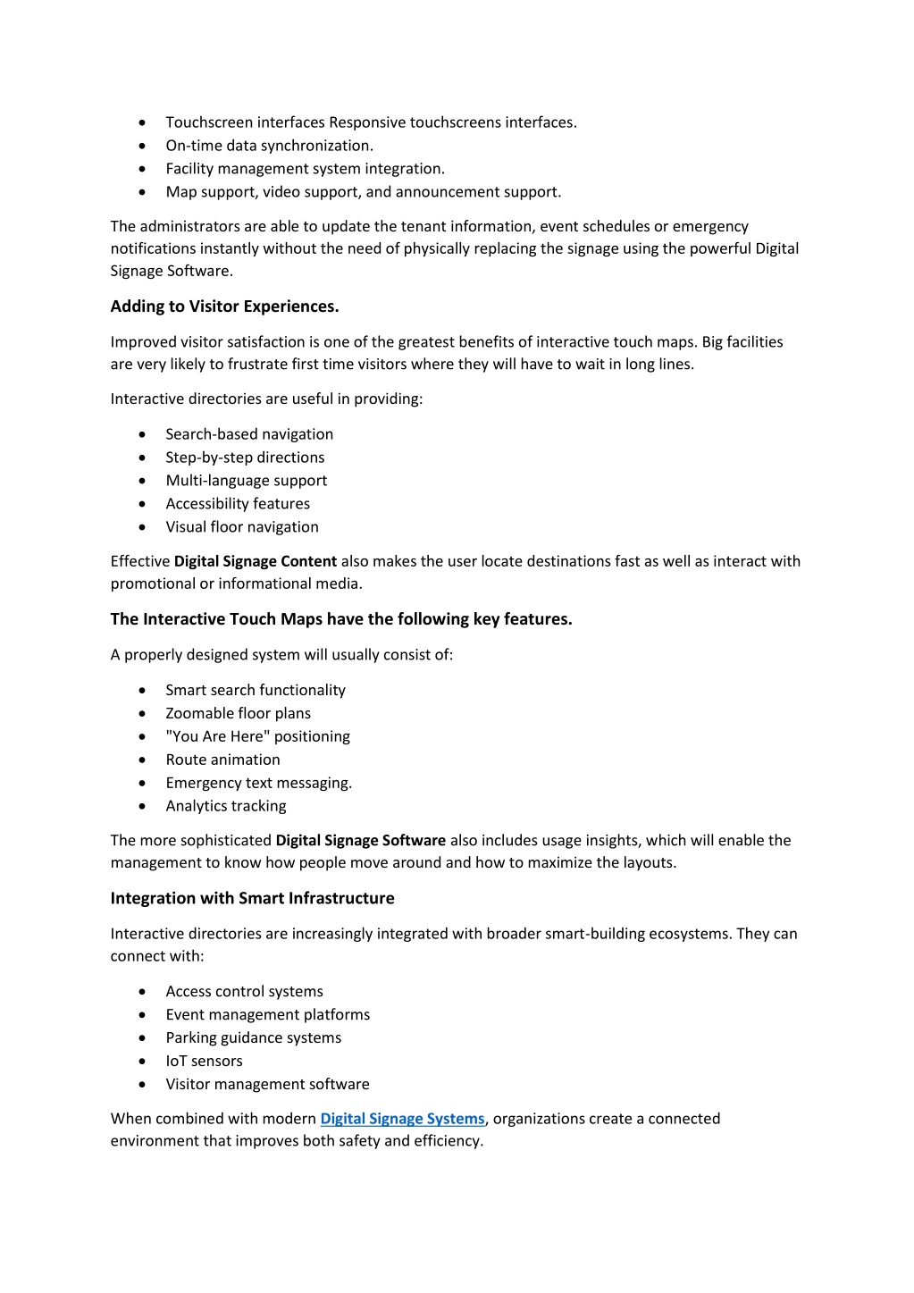 •Touchscreen interfaces Responsive touchscreens interfaces. •On-time data synchronization. •Facility management system integration. •Map support, video support, and announcement support. The administrators are able to update the tenant information, event schedules or emergency notifications instantly without the need of physically replacing the signage using the powerful Digital Signage Software. Adding to Visitor Experiences. Improved visitor satisfaction is one of the greatest benefits of interactive touch maps. Big facilities are very likely to frustrate first time visitors where they will have to wait in long lines. Interactive directories are useful in providing: •Search-based navigation •Step-by-step directions •Multi-language support •Accessibility features •Visual floor navigation Effective Digital Signage Content also makes the user locate destinations fast as well as interact with promotional or informational media. The Interactive Touch Maps have the following key features. A properly designed system will usually consist of: •Smart search functionality •Zoomable floor plans •"You Are Here" positioning •Route animation •Emergency text messaging. •Analytics tracking The more sophisticated Digital Signage Software also includes usage insights, which will enable the management to know how people move around and how to maximize the layouts. Integration with Smart Infrastructure Interactive directories are increasingly integrated with broader smart-building ecosystems. They can connect with: •Access control systems •Event management platforms •Parking guidance systems •IoT sensors •Visitor management software When combined with modern Digital Signage Systems, organizations create a connected environment that improves both safety and efficiency.
