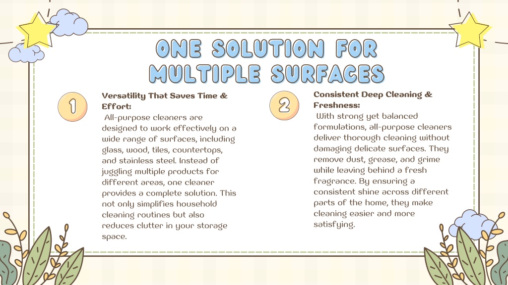 ONE SOLUTION FOR MULTIPLE SURFACES MULTIPLE SURFACES Versatility That Saves Time & Effort: All-purpose cleaners are designed to work effectively on a wide range of surfaces, including glass, wood, tiles, countertops, and stainless steel. Instead of juggling multiple products for different areas, one cleaner provides a complete solution. This not only simplifies household cleaning routines but also reduces clutter in your storage space. ONE SOLUTION FOR Consistent Deep Cleaning & Freshness: With strong yet balanced formulations, all-purpose cleaners deliver thorough cleaning without damaging delicate surfaces. They remove dust, grease, and grime while leaving behind a fresh fragrance. By ensuring a consistent shine across different parts of the home, they make cleaning easier and more satisfying. 2 2 1 1