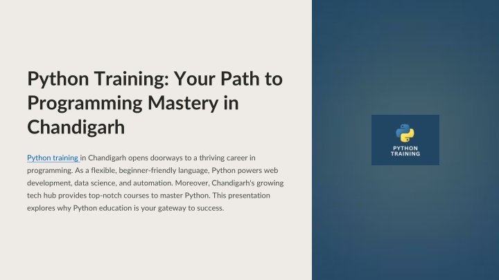 Python Training: Your Path to Programming Mastery in Chandigarh Python trainingin Chandigarh opens doorways to a thriving career in programming. As a flexible, beginner-friendly language, Python powers web development, data science, and automation. Moreover, Chandigarh's growing tech hub provides top-notch courses to master Python. This presentation explores why Python education is your gateway to success.