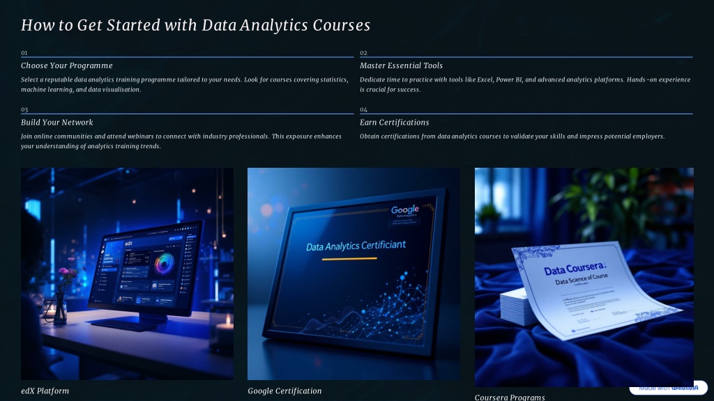 How to Get Started with Data Analytics Courses 01 02 Choose Your Programme Master Essential Tools Select a reputable data analytics training programme tailored to your needs. Look for courses covering statistics, machine learning, and data visualisation. Dedicate time to practice with tools like Excel, Power BI, and advanced analytics platforms. Hands-on experience is crucial for success. 03 04 Build Your Network Earn Certifications Join online communities and attend webinars to connect with industry professionals. This exposure enhances your understanding of analytics training trends. Obtain certifications from data analytics courses to validate your skills and impress potential employers. edX Platform Google Certification Coursera Programs Comprehensive university-level courses Industry-recognised credentials Flexible, beginner-friendly options Overcoming Challenges in Analytics Education To start, identify a reputable data analytics training programme tailored to your needs. Platforms like edX or Google's Data Analytics Certification offer comprehensive data analysis programmes. Moreover, networking plays a crucial role in your success journey.