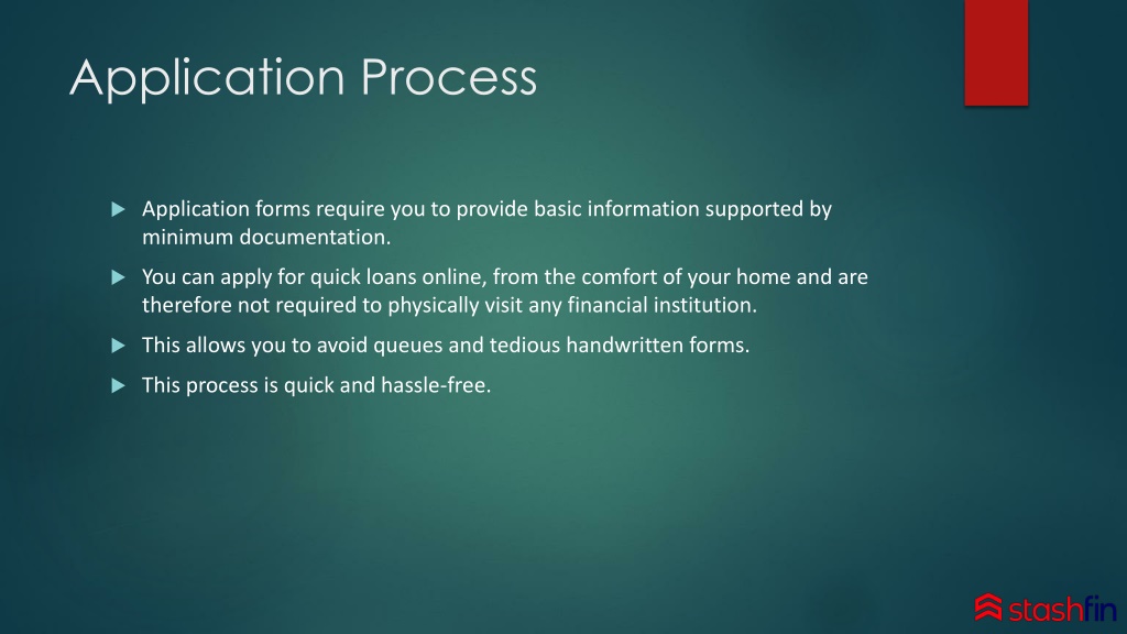 Need any urgent financial aid? or any emergency fund? Stashfin gives you the best solution; apply for a quick personal loan online and get the money instantly; You can avoid the efforts of standing in the long lines, filling out the paper works/ loan applications, and submitting to the physical financial institutions. Enjoy the Easy Application Process, Quick Processing Time, Immediate Transfer of Funds, and more.<br><br>https://www.stashfin.com/quick-personal-loans<br><br>