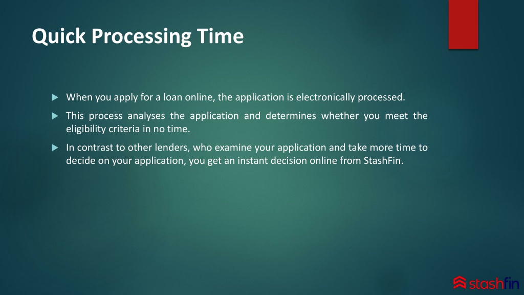 Quick Processing Time • When you apply for a loan online, the application is electronically processed. • This process analyses the application and determines whether you meet the eligibility criteria in no time. • In contrast to other lenders, who examine your application and take more time to decide on your application, you get an instant decision online from StashFin.